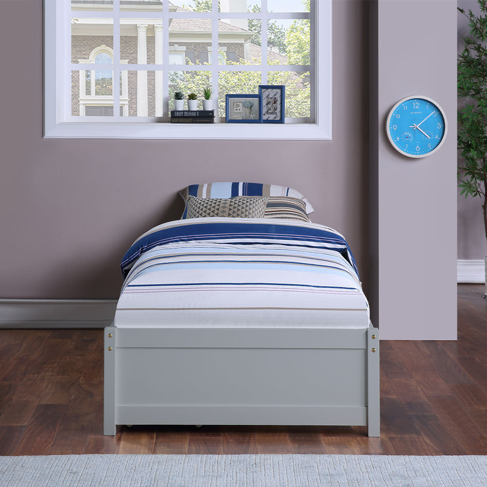 An updated take on a sheltering wingback, our harper upholstered tall headboard creates a cozy backdrop for layered bedding and pillows. The simple platform bed frame has three pullout drawers on one side, all of which have plain fronts (no handles or notches) and sit flush side by side. Made from birch in white finish, this bed has midbeam and slatted bed base. We bought wrington storage platform bed by. Whether you're expecting company or making the most of a tight space, this trundle bed gives you an.